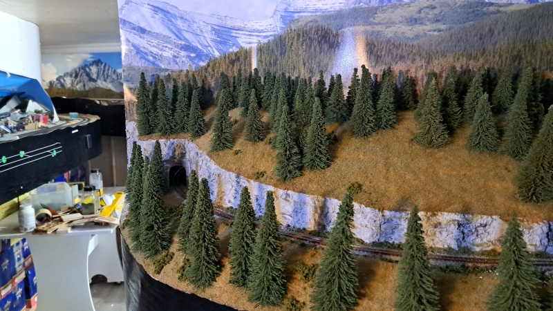 work continued on the "horseshoe" part of the layout. well, not really horseshoe. at least not the track. but the landscape. after letting the putty dry for a few days i planted a few trees, added small bushes and all that stuff.