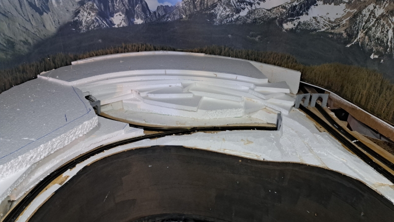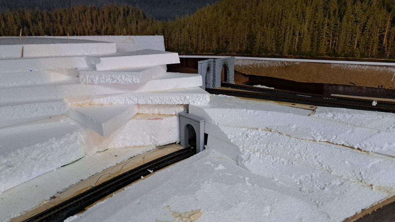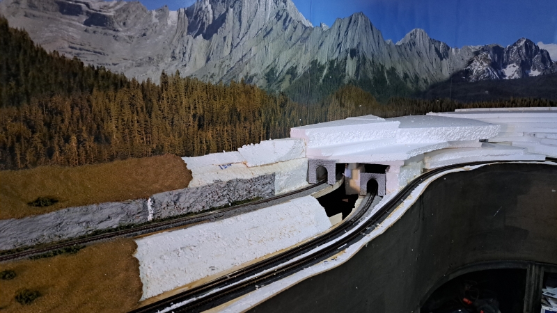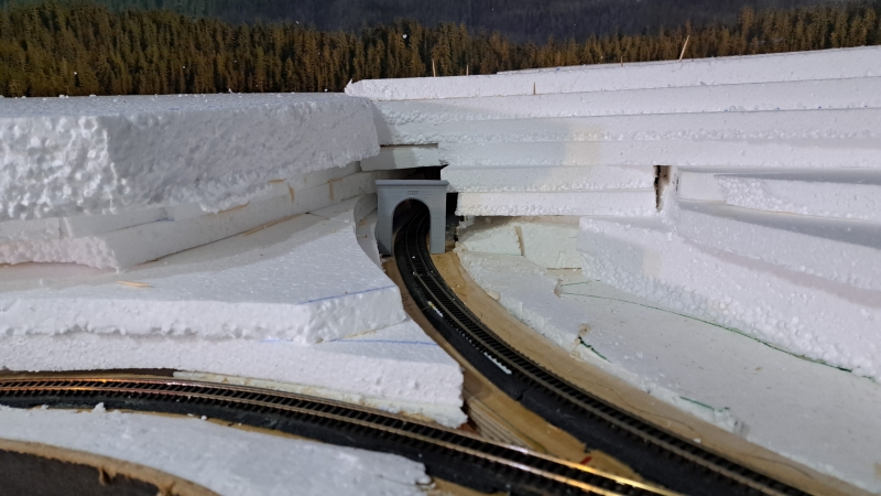 installing all the tunnel portals will be the step after shaping the landscape. usually this means quite a bit of work. trimming the portals, checking clearance of different rolling equipment, adding rock walls and such. takes easily 5-10 hours per tunnel portal. this part of the layout will feature another 8 tunnels. 2 are already in place, 6 more to go. so stay tuned !